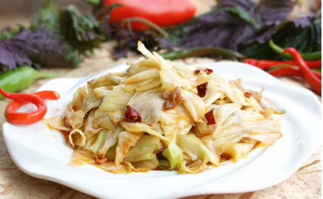 食材:圆白菜、蒜、红辣椒、盐、花椒、鸡精、白醋、香油