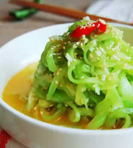 2、将莴笋去皮切细丝放入碗中,加适量的盐,抓腌一下并挤去多余水份,加入鸡精、辣椒油,再将做法(一)的蒜泥连油一起倒入,拌匀即可