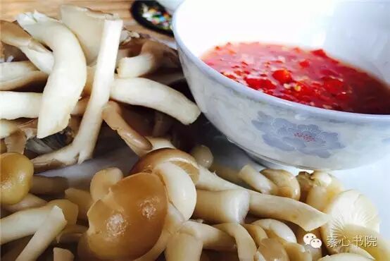 将剁椒酱盖在已经调味搅拌均匀的各种菇上