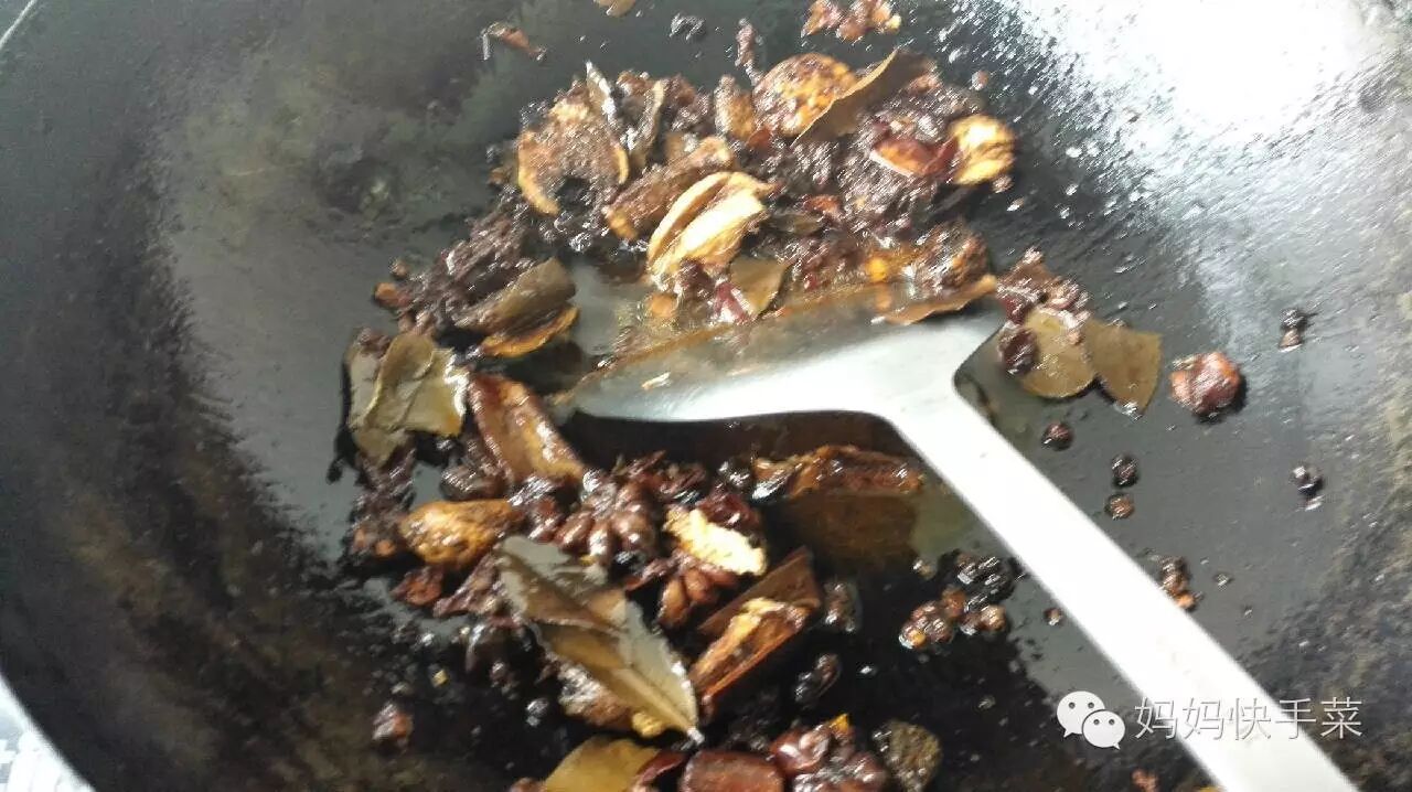 8、起油锅,炒香料。我一般分三个步骤一是先炒耐炒的姜蒜,二是下八角、麻椒、红椒、香叶、桂皮,三是下郫县豆瓣酱,请炒香一样再下另一样,这样出来才香,不会糊一片。