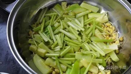 7、起油锅,用一点点油把芹菜炒至断生,铺在黄豆芽上。