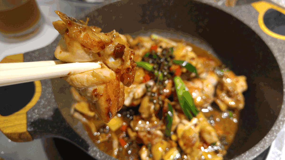 这道菜据说发源于重庆江北的铁山坪,鸡肉渗透着浓浓的花椒清香,鲜香麻辣,嚼劲十足。这道菜经大厨改良后,香麻适中,即使是吃不惯花椒的食客,也不会嫌麻,吃到嘴里,是一种酥麻的感觉,恰到好处,多一分则难受,少一分则不够。