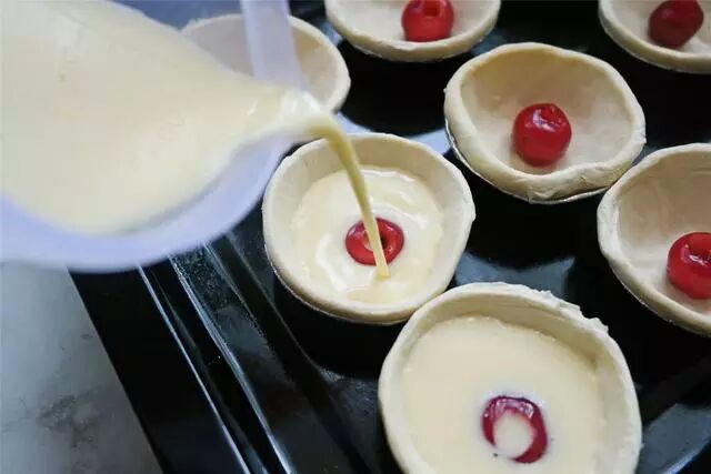 蛋挞是以蛋浆为馅料倒入由牛奶及蛋黄混合而成的蛋浆制成,烤出的蛋挞外层为松脆之挞皮,内层则为香甜的黄色凝固蛋浆。樱花才下枝头樱桃又上舌尖,没有使用玉米淀粉,口感更嫩滑,几个樱桃蛋挞便可以成为一个美好的下午茶。
