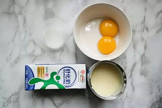 3. 将牛奶,蛋黄,炼乳,细砂糖混合打散,搅拌均匀静置备用