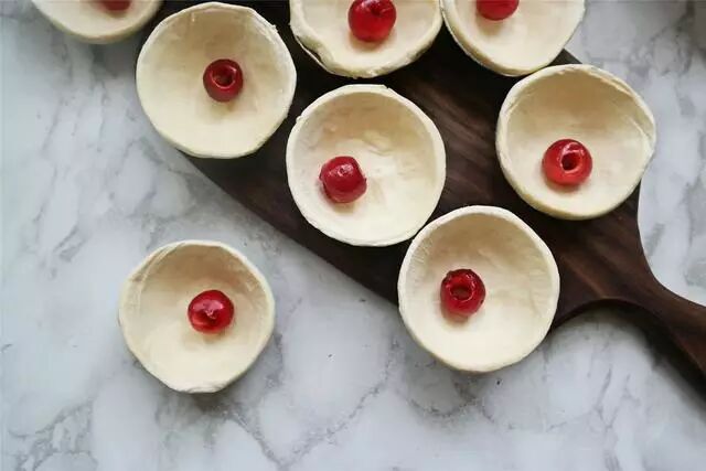5. 每个蛋挞皮中放一颗樱桃果肉