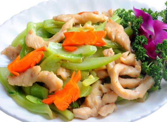 1.芹菜刮去皮丝,用刀切成细条,胡萝卜切条。