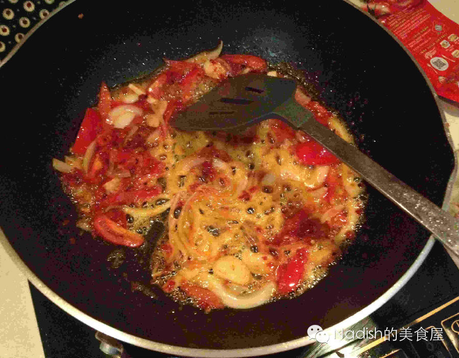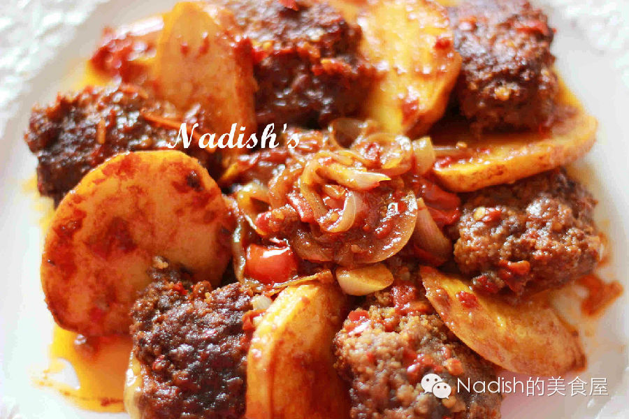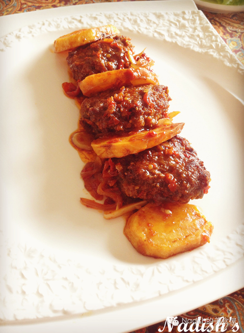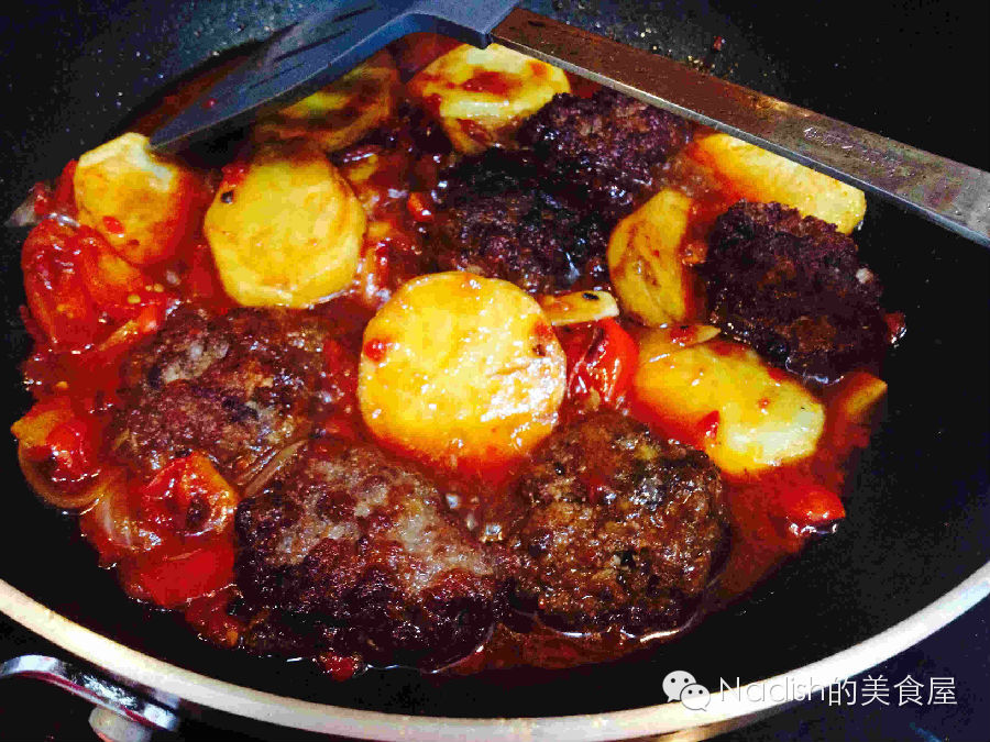 6、现在说说红烧katlit的料汁:另起一个新锅,倒入少量油,烧热,把切好的了洋葱丝、蒜片下锅煸炒出香味,再把西红柿加进来翻炒,如果想上色,可以放点剁碎的干辣椒,再放点盐、两大勺番茄酱,炒匀,倒入一杯水烧到翻滚,把炸好的肉丸、土豆下锅,盖上盖子,焖到收汁,就可以盛盘啦!