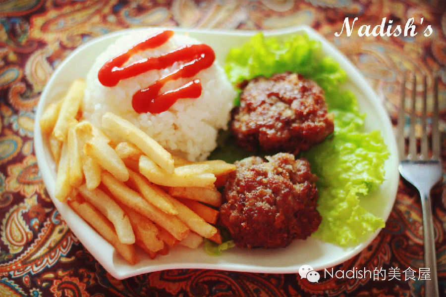 5、这个时候呢,西式的katlit就其实已经可以摆盘啦,一小碗米饭,摆点奶油生菜,上面放两个katlit,这样比较吸油,然后摆点薯条啦,撒点番茄酱啦,尽情发挥就ok啦~