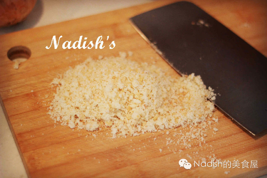 厚馕,切三片,去掉金黄壳部分,取其中白色面,绞碎成馕渣