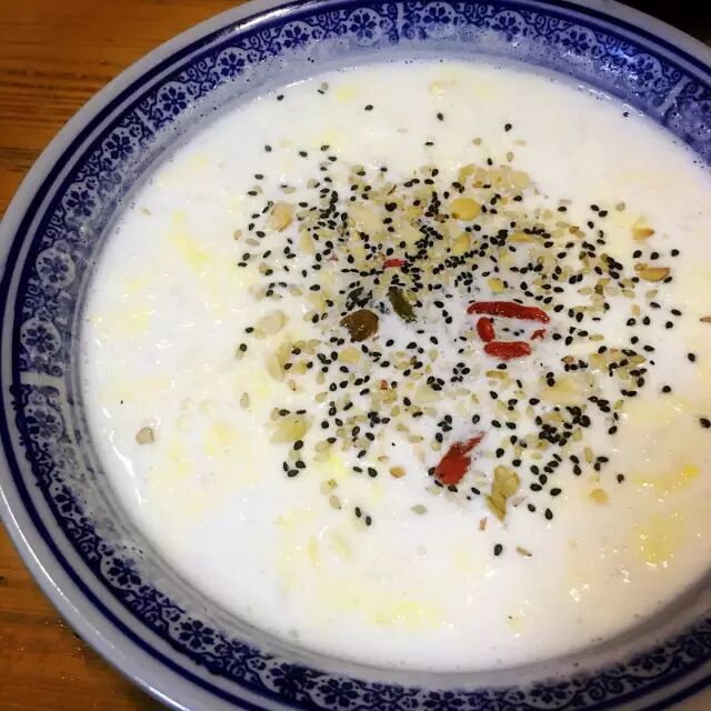 近年来很火的小吃,说实话应该不算兰州本地的特色,不过实在太火。就是把醪糟煮开、冲入热牛奶,再加入葡萄干、芝麻、花生碎、枸杞等,一碗香气扑鼻。