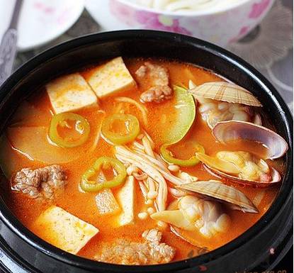 2、牛肉和蛤蜊增加了大酱汤的鲜味,南瓜可以中和辣酱的辛辣味道,使汤变得有丝丝甜意,建议大家一定要试一试。