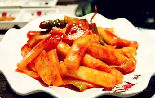 年糕450克、韩式辣酱8克、水150克、番茄沙司8克、芝麻2克、花生油1小勺