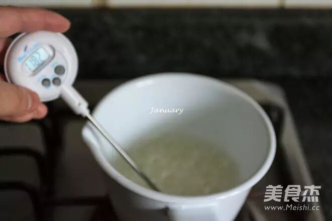 6.水和细砂糖放入奶锅中,用小火烧至118度关火;