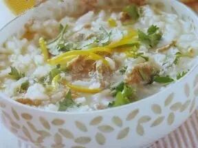 2、牛肉切薄片,拌入调味料(1)略腌;橘皮切丝,待米粒熟软时和牛肉一起加入同煮至熟。