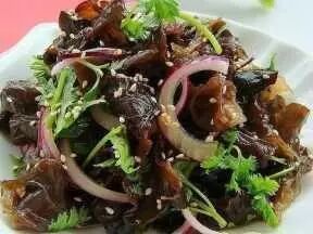 木耳一把,香菜三棵,洋葱一个,花椒油,凉拌酱油,醋,盐,糖,香油,熟芝麻