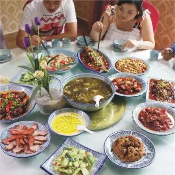 四川农家菜:以本地农家养殖禽蓄和种植的蔬菜,按四川传统川味做法烹制。口味钵钵鸡、酸汤豆花鱼、宫保肉丁、川味冒菜、土豆片回锅肉、蚂蚁 上树、麻婆豆腐、酸辣凉面、相思红豆、烩青菜、老坛泡菜、蕃茄蛋花汤。10人围桌10菜1汤。
