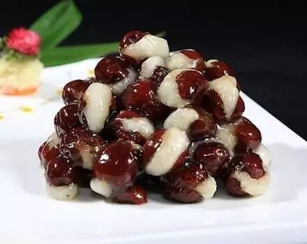蜜汁金枣,是山东美食,用山药泥包入枣泥馅制成枣状,入油中炸透成金黄色,然后熬蜜糖汁,将炸好的金枣入锅内焖至汁浓,虽非真枣却具有枣之神韵。此菜形似金枣,馥郁甘腴,较之真品更胜一筹。