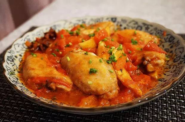 材料:鸡胸肉1000g,红酒醋3汤匙,洋葱1个,蒜5瓣,老姜1块,孜然2茶匙,香菜碎2茶匙,豆蔻籽,肉桂粉1茶匙,丁香5粒,花椒20粒,辣椒粉1茶匙,盐2茶匙,番茄酱1汤匙,油3汤匙。