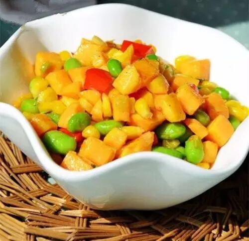 1、将番茄洗净,切小丁;甜玉米粒洗净,沥水,备用。