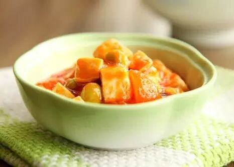 6、放入豆腐炒熟后,放入豌豆和番茄酱汁、盐、炒匀即可出锅。