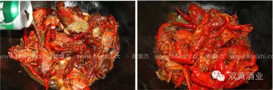 3.倒入清理好的小龙虾炒至尾巴全部卷起,加料酒,醋炒匀