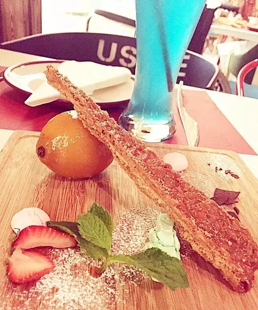 装修很有特色,好像岩洞一样的墙壁,装点着玫瑰花,门口是一片拼接瓷砖和大熊。草莓千层酥颜值高味道还好!卡仕达奶油一点都不腻配着草莓酸酸甜甜的简直好吃爆了~甜点问号柠檬更是我没有见过的,把奶酪注进柠檬皮里,两者互相浸透,不会酸也不会腻,一万赞!