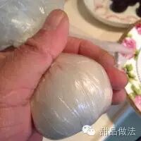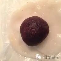 12. 最后收口捏紧揉圆,取掉保鲜袋,将做好的麻薯投入熟糯米粉中滾匀,以防粘连。熟糯米粉需事先准备好,就是把干的水磨糯米粉倒入碗中,包好保鲜膜,上锅蒸15分钟即可。