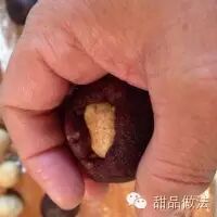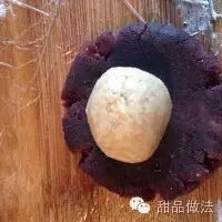 6. 将豆沙馅按扁,放上花生馅,用刀铲起放在手心。