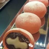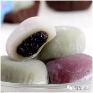 13. 麻薯做好了!如果需要做成不同的颜色,则在冷却的糍粑装入袋子揉合时,分别加入适量的抹茶粉、咖啡、红曲粉或者粉碎的枸杞子粉,或加入适量的南瓜泥,分别可以揉制出浅绿、粉红、浅咖色、淡黄色的糍粑。