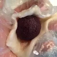 11. 连同底下的保鲜袋,取起糍粑放于手心,轻轻合拢,将馅包入糍粑中。