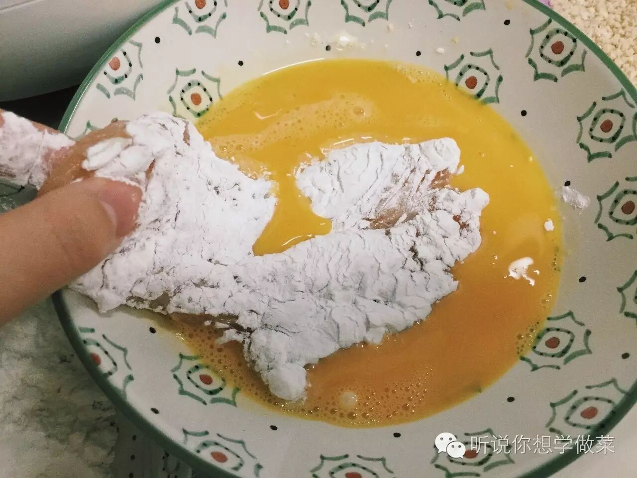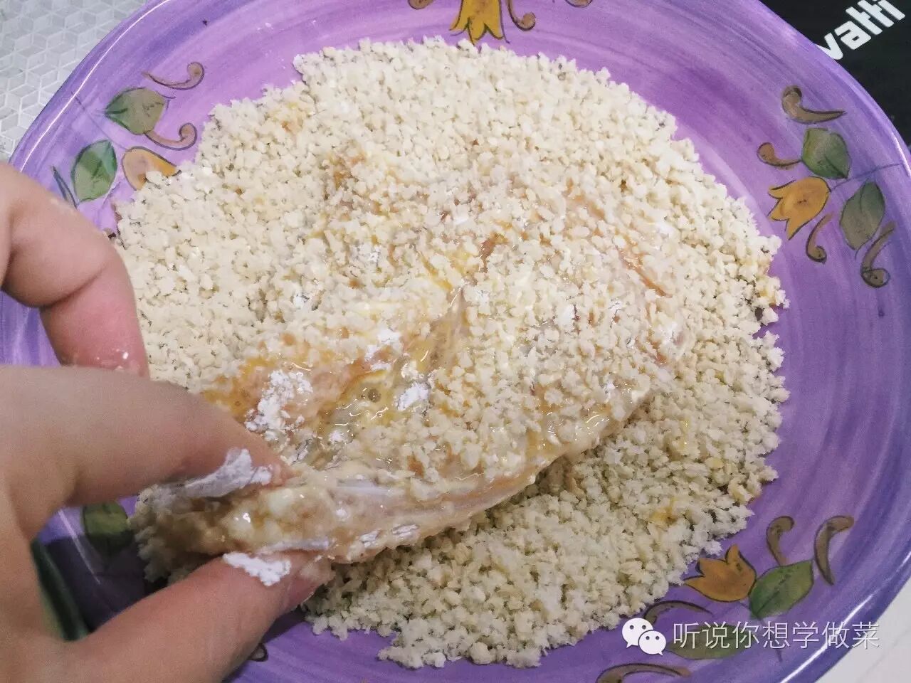 3、腌好的鸡胸把蒜头去掉(不放蒜的直接忽略这步),鸡胸肉均匀裹上淀粉,再均匀裹上蛋液,再均匀按压裹上面包糠。