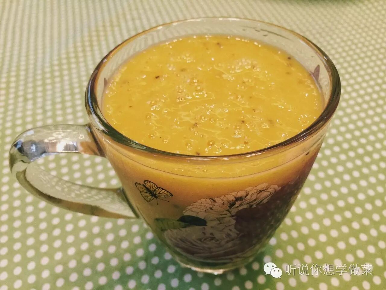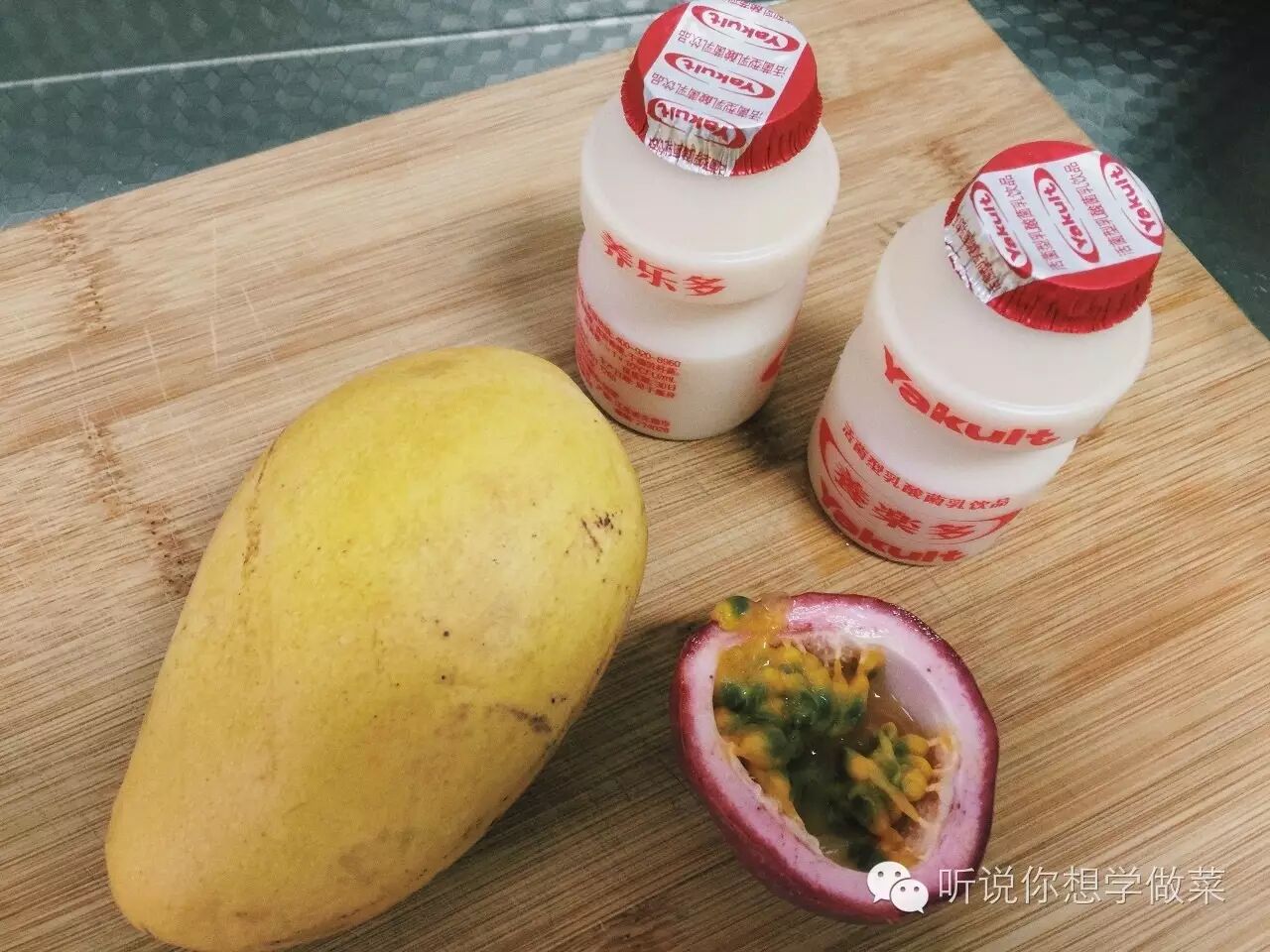 一个小芒果+半个或一个百香果+两瓶养乐多放入搅拌机搅拌均匀即可。
