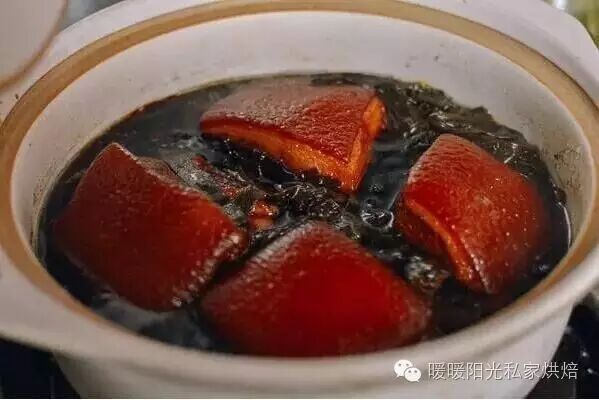 盖上锅,大火烧开,然后小火炖90分钟。这之后有两种方法可供选择:将炖好的五花肉翻转,皮朝上,淋上煮肉时的原汁,用小火蒸30分钟。