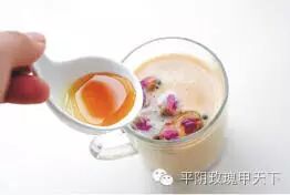 玫瑰花能降火气,可调理血气、促进血液循环、养颜美容,且有消除疲劳、保护肝脏胃肠功能的功效。蜂蜜 含有丰富的氨基酸和果糖,具有排毒养颜 减少色素沉着,淡化色斑、润肠通便的功效。 牛奶味甘性微寒,具有生津止渴、滋润肠道、清热通便、补虚健脾等功效。因此,用它们来调制奶茶,既养身又养颜,是女性朋友不可或缺的健康饮品。