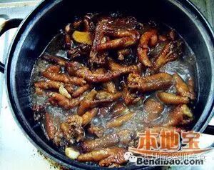 4、另取锅,下入卤水,白糖、盐、花椒、鸡精、绍酒,烧开,去浮沫,放入鸡爪、葱姜,用小火卤熟即成。