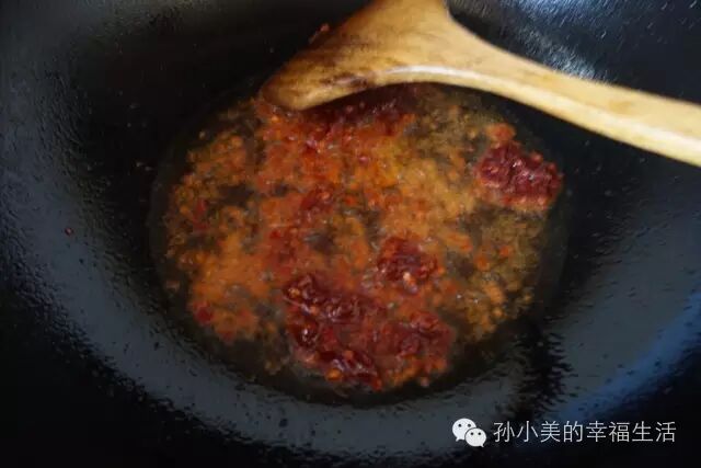 锅里烧热油将郫县豆瓣酱炒出红油。