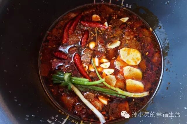 材料:牛肉500g、小葱3根辣椒5个、花椒适量、八角3颗、茴香籽适量、冰糖5颗郫县红油豆瓣酱2勺、面条适量。