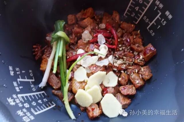 把炒好的牛肉倒进电饭煲或高压锅里,加冰糖。