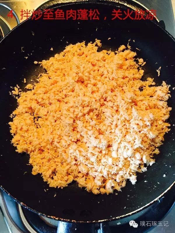 TIPS: 如果量不多,其实只需要几分钟就炒好了。我边炒边用铲子将鱼肉弄得更碎,就不用再入搅拌机了。关火后不用马上盛起来,放在锅里放凉,还可以利用余温继续烘干。