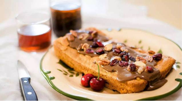 o 用黄油涂抹9*5英寸的loaf蛋糕方形烤盘,将混合好的面糊倒入蛋糕烤盘,325华氏度烘烤1小时左右(可用牙签刺穿,如果没有湿湿的粘黏的面糊就是考好了)。烤好后,冷却1小时后脱模。