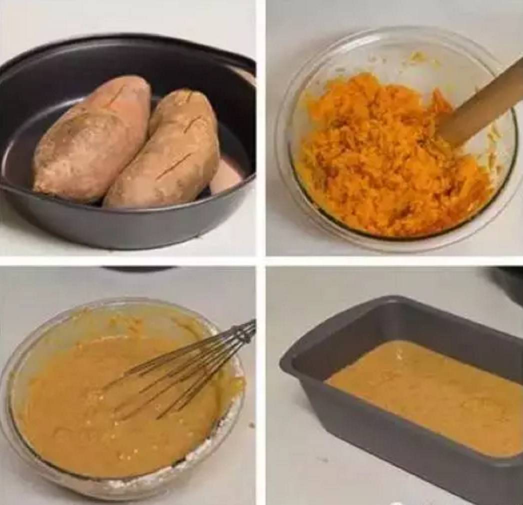 o 将烤好的红薯去皮,倒入牛奶,碾碎至没有明显的块状;再加入糖、鸡蛋、食用油、香草精、盐,搅拌均匀。加入过筛面粉,搅拌。