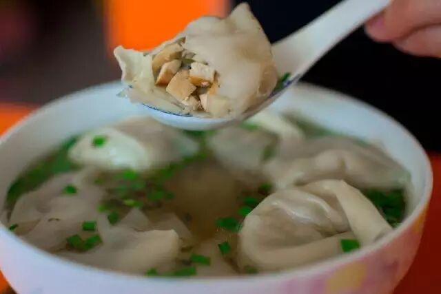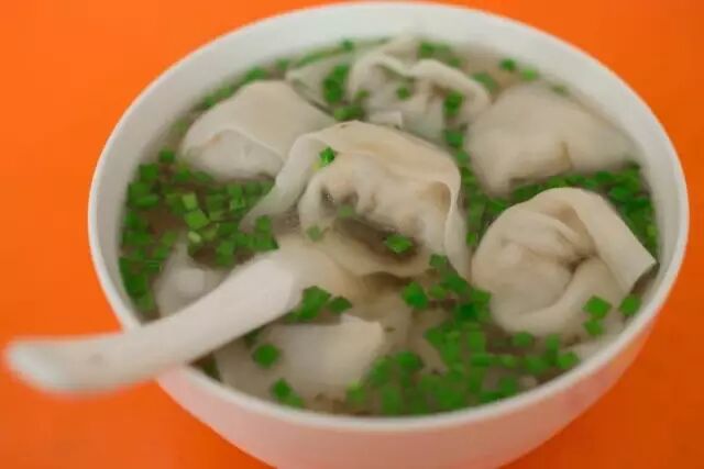 馄钝用薄面皮包馅,重汤料,汤水中放入韭菜、虾皮、紫菜等,汤清味鲜。