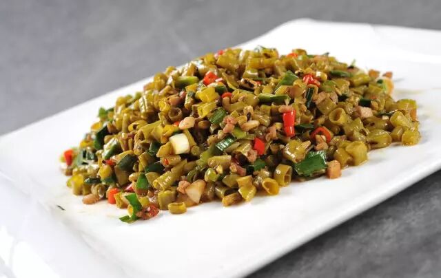 3.锅烧热,先炒豆角。因为豆角要比较多的油。豆角要炒久一点,干了加水继续,要不然会有臭青味。炒好待用。
