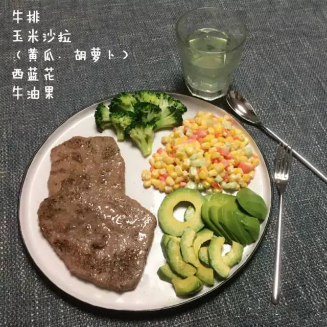 牛排+玉米沙拉+西兰花+牛油果+柠檬汁