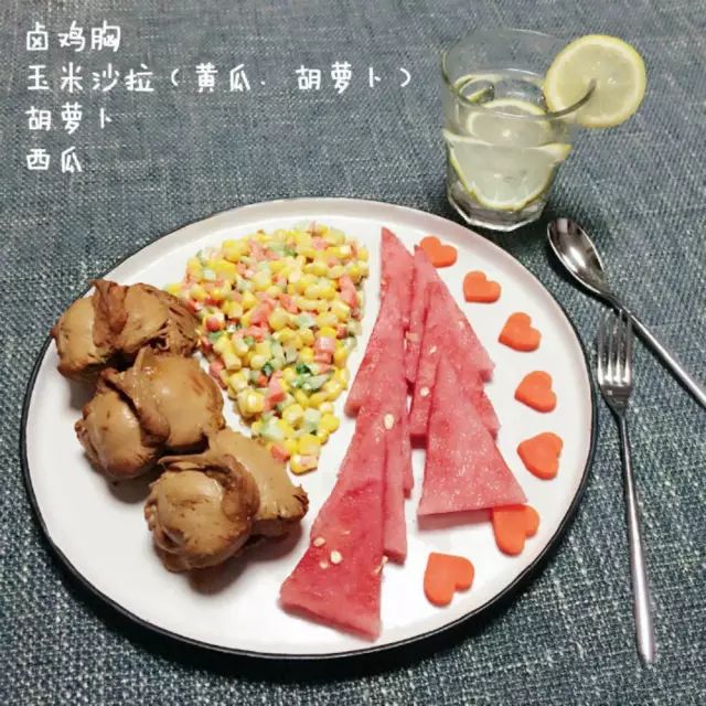 卤鸡胸+玉米沙拉+胡萝卜+西瓜+柠檬水