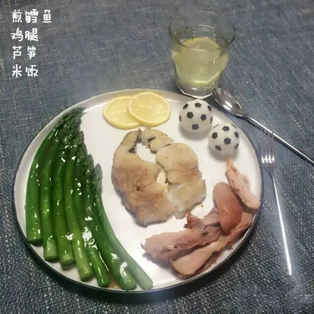 煎银鳕鱼+鸡腿+芦笋+柠檬水
