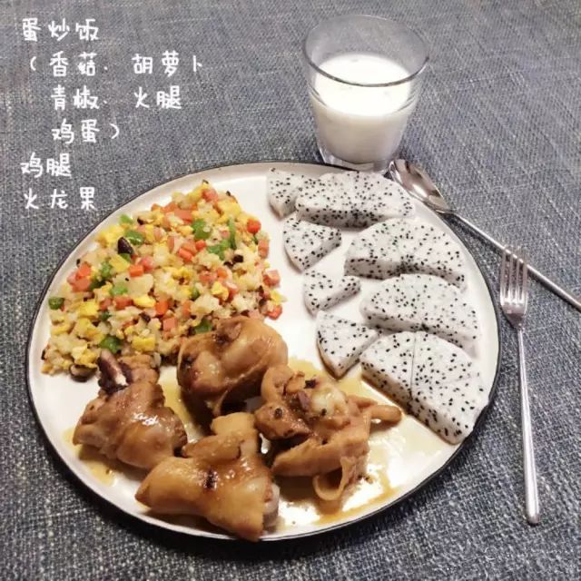 鸡腿+蛋炒饭+火龙果+牛奶鸡腿+蛋炒饭+火龙果+牛奶