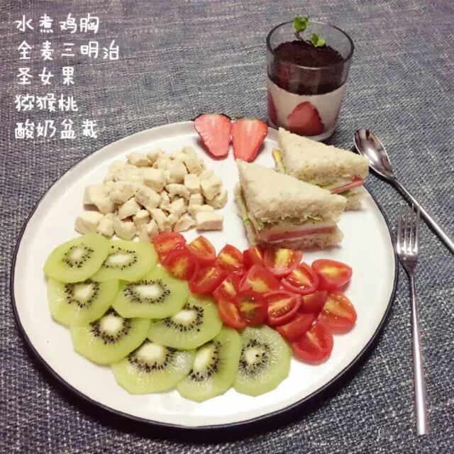 水煮鸡胸肉+全麦三明治+圣女果+猕猴桃+酸奶盆栽