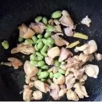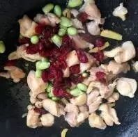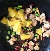 7. 毛豆变色后下入蔓越莓干并继续翻炒均匀。