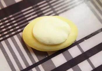 按照比例 取小团黄色面团 揉成椭圆 稍微压扁